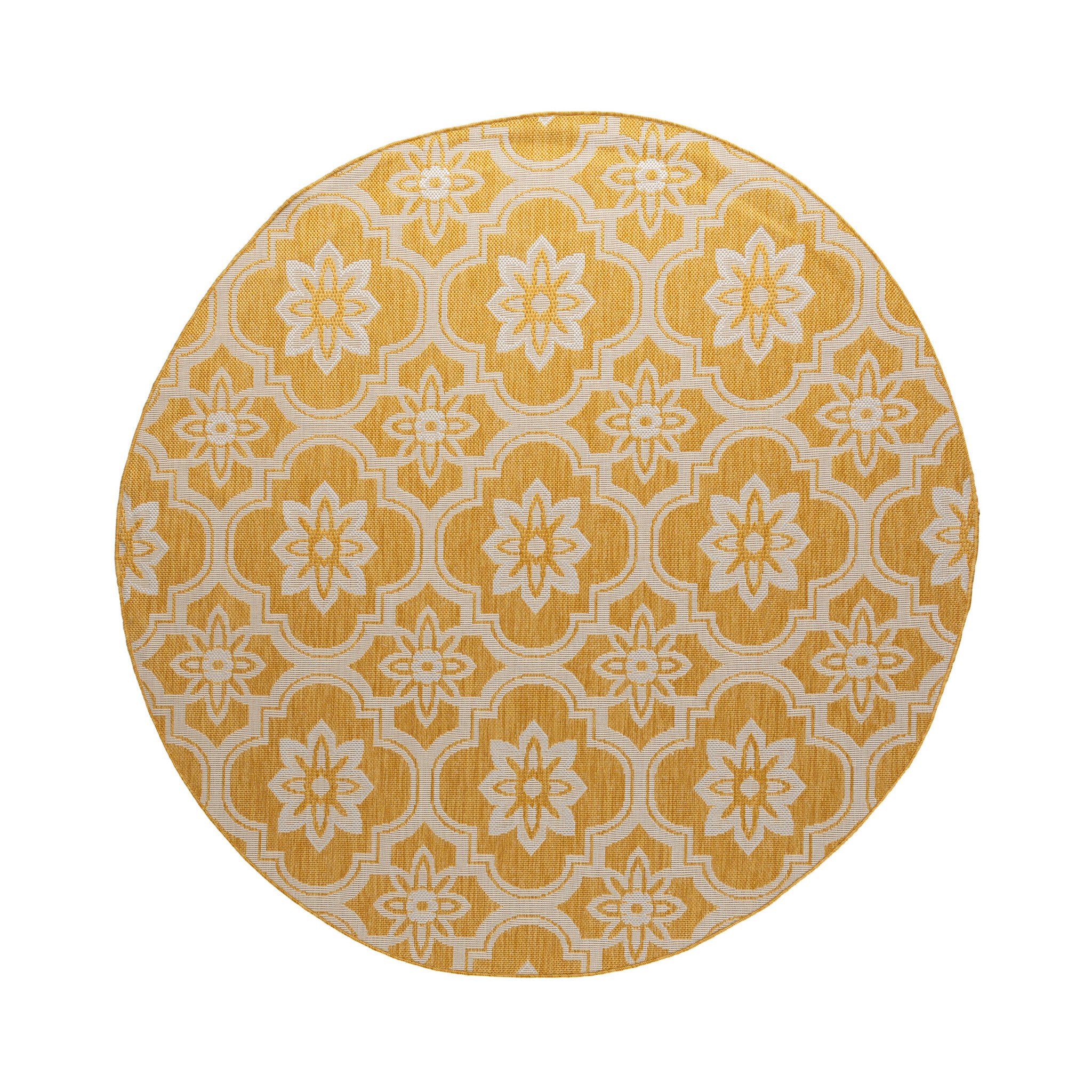 Den runda utomhusmattan – Rio Flower Gul är den perfekta kombinationen av vintage-charm och modern funktionalitet. Det gul-vita, grafiska blommönstret är en lekfull blinkning till gamla mosaikplattor och kommer till sin rätt mot trädgårdens grönska eller på en solig balkong. Den runda formen skapar mjuka linjer som enkelt tillför värme till strama terrasser eller moderna utehörn.