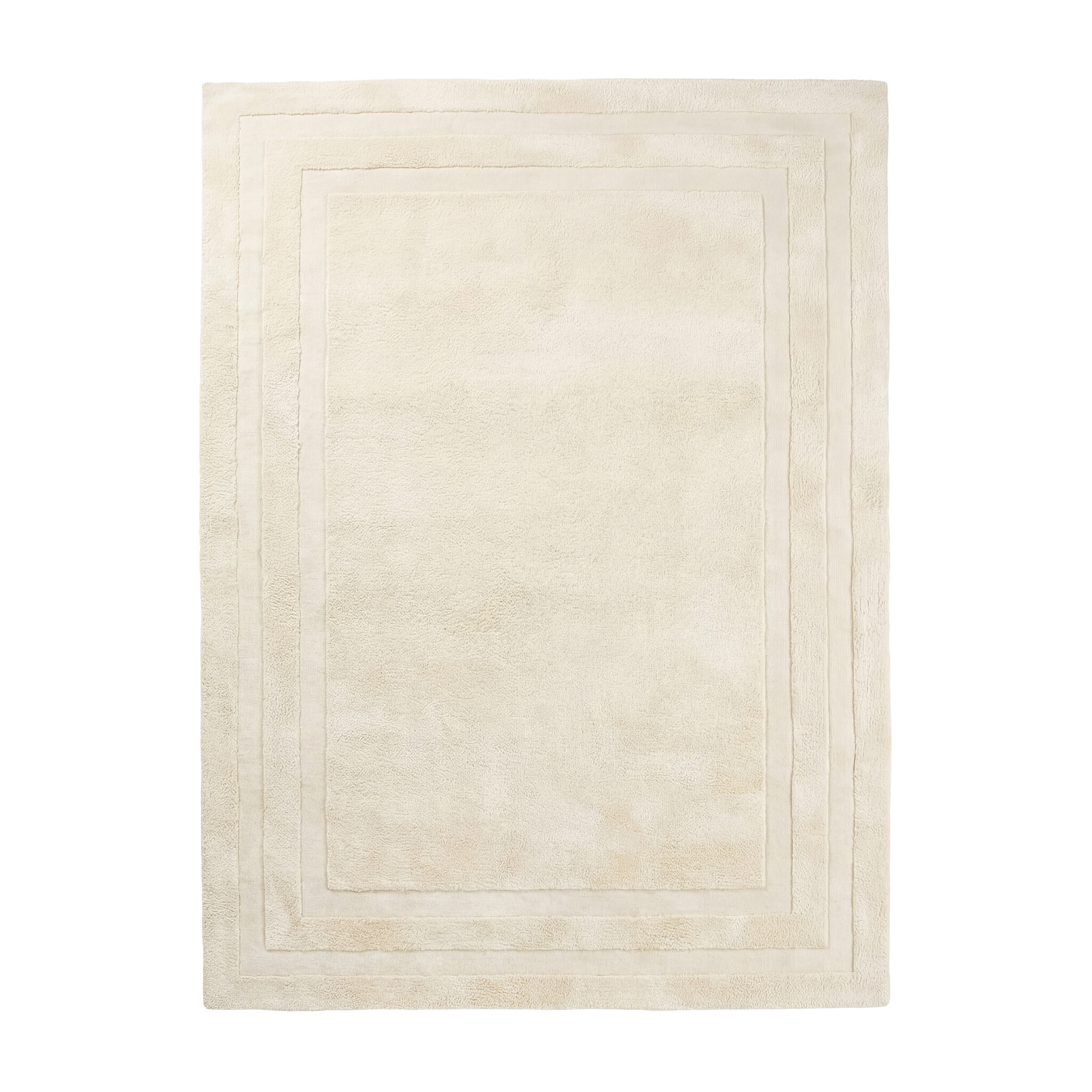 Kanten är inte tryckt utan skuren direkt i ullpolen för hand. Det skapar en tredimensionell inramning med ett ljusspel som skiftar beroende på var du står i rummet. Resultatet är en matta som definierar ytan den ligger på, med känslan av en äkta designmatta.